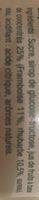 Ingredients: sucre, sirop de glucose-fructose, jus de fruits à base de concentrés 25% (framboise 11%, rhubarbe 10,5%, sureau), eau, acidifiant: acide citrique, arômes naturels