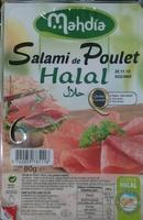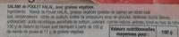 Ingredients: Viande de Poulet HALAL, graisse végétale (graisse de palme), sel nitrité iodé (sel, conservateurs : nitrite de sodium, iodate de potassium), sirop de glucose, dextrose, sucre, épices, antioxydant : acide ascorbique, ascorbate de sodium, colorant : carmin naturel, arômes, fumé au bois de hêtre. 100 g de salami de poulet sont fabriqués à partir de 100 g de viande de poulet et 17 g de graisse végétale.
