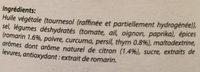 Ingredients: Huile végétale (tournesol (rafinée et partiellement hydrogénée)), sel, légumes déshydratés (tomate, ail, oignon, paprika), épices (romarin 1.6%, poivre, curcuma, persil, thym 0.8%), maltodextrine, arômes dont arôme naturel de citron (1.4%), sucre, extraits de levures, antioxydant : extrait de romarin.