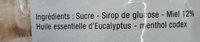Ingredients: Sucres, miel, 12 %, essence naturelle d'eucalyptus, menthol.