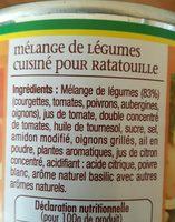Ingredients: méLanGe de LéGumes culSlné pouR Ratatou1LLe Ingrédienb : Mélange de légumes (83%) (courgettes, tomates, poivrons, aubergines, oignons), jus de tomate, double concentré de tomates, huile de tournesol, sucre, sel, amidon modifié, oignons grillés, ail en poudre, plantes aromatiques, jus de citron concentré, acidifiant : acide citrique, poivre blanc, arôme naturel basilic avec autres arômes naturels. Déclaration nutritionnelle (pour 100g de produit) 1 46 kJ Energie
