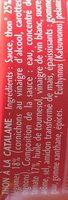 Ingredients: Sauce (eau, concentré de tomate 17%, huile de tournesol, vinaigre de vin blanc, sucre, sel, arôme, amidon transformé de maïs, épices, épaississants : gomme guar et gomme xanthane), thon 25%, légumes 18% (cornichons au vinaigre d'alcool, carottes, oignons)