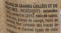 Ingredients: amandes (30 %), cranberries (25 %), noix de cajou, raisins secs, graines de courge, huile de tournesol.