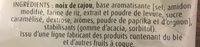 Ingredients: Noix de cajou, base aromatisante (sel, amidon modifié, farine de riz, extrait et poudre de levure, sucre caramélisé, dextrose, arômes, poudre de paprika et d'oignon), stabilisants (gomme d'acacia, sorbitol).