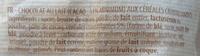 Ingredients: sucre, beurre de cacao, poudre de lait entier, lactosérum en poudre, pâte de cacao, céréales croustillantes 5% (farine de blé, sucre, malt de blé, poudre à lever : carbonate acide de sodium, émulsifiant : lécithine, sel, arôme), poudre de lait écrémé, matière grasse de lait anhydre, émulsifiant : lécithine, arômes.