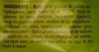 Ingredients: œuf 25%, graisse de palme non hydrogénée, sucre, farine de riz 11,6%, fécule de pomme de terre, dextrose, humectant (glycérol), sirop de glucose, arôme, amidon de riz, émulsifiant : lécithines de colza, épaississant : gomme guar, poudres à lever : diphosphates, carbonates de sodium, phosphates de calcium, sel, arôme.
