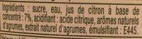 Ingredients: Sucre, eau, jus de citron à base de concentré : 7%, acidifiant : acide citrique, arômes naturels d'agrumes, extrait naturel d'agrumes, émulsifiants E445.