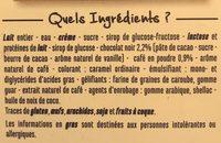 Ingredients: Crème glacée café 94 % : lait entier, eau, crème fraiche, sirop de glucose-fructose, sucre, lactose et protéines de lait, sirop de glucose, café en poudre 1 %, arôme naturel café, caramel ordinaire, mono- et diglycérides d'acides gras, farine de graines de caroube, gomme guar. Inclusions dragéifiées au cacao et au café 6 % : sucre, chocolat noir 38 % (sucre, pâte de cacao, beurre de cacao), eau, extrait naturel de café 2 %, sirop de glucose, gomme arabique, shellac.