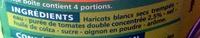 Ingredients: Haricots blancs secs trempés, eau, purée de tomates double concentrée 2,5 %, sel, huile de colza, sucre, oignon en poudre, arôme.