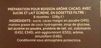 Ingredients: sucre, cacao maigre en poudre (14%), matière grasse de coco hydrogénée, sirop de glucose, lait écrémé en poudre, protéine de lait, sel, stabilisants (E452, E340), anti-agglomérant (E551), arôme, émulsifiant (E481). Conditionné sous atmosphère protectrice.