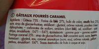 Ingredients: GÂTEAUX FOURRÉS CARAMEL : 75% : Farine de blé 27%, huile de colza, Œufs frais 21%, sucre, sirop de glucose-fructose, stabilisant : glycérol, arômes naturels, poudres à lever : diphosphates-carbonates de sodium, amidons (dont blé), sel, acidifiant : acide citrique, émulsifiants : E471- E475, épaississants : gomme guar- gomme xanthane. Fourrage caramel 25% : sirop de glucose-fructose, lait concentré sucré, sucre, beurre, humectant : glycérol, eau, caramel aromatique ( sucre, eau), arômes naturels, gélifiant : pectines, émulsifiant : E471. Traces éventuelles de fruits à coque et soja