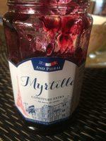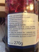 Ingredients: sucre de canne, myrtilles, gélifiant : pectine de fruits, acidifiant : jus de citron concentré. Pour 100g de produit fini : préparée avec 52g de fruits et teneur totale en sucres : 619 Traces éventuelles de fruits à coque et de Poids net :