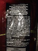 Ingredients: chocolat noi'a( cacao, sucre, matière grasse de laieanhù urre de cacao, émulsifiant : lécithine des crecgraisse de palme, noisettes, cacao maigre , amandes, lait entier en poudre, huile de urne/ de cacao, "'l ) lactosérum en éclats de es de càcao, rrefie poudre* , ats de crêped elléè(sqte, farine de blé, huiled 'Iza, matière grasSè de lait anhydre, lactose*, protév de lait, sel, extraitde malt d'orge, poudre à de sodium, émulsifiant : lécithine de tournesol, antioxydant :aE306), grains (amandes torréfiées, pâte de cacao, chocolat au'lait (sucre, beurre de cacao, lait entier en poudret pâte de cacao, lactose*, lactosérum en poudre*, émulsifiànNécithine de soja émulsifiant : lécithine de soja. * Dont lait. Traces éventuelles de : noix, noix de cajou, noix de pécan, pistaches, arachides et oeuf. INFORMATIONS : A consommer de préfèrence avantfin:/ Lot NO : voir sur le côté du sachet. A conserverl!06dJ réfrigérateur, à l'abri de la chaleur et de l'humidite?