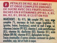 Ingredients: riz 41%, blé complet 29%, sucre, orge complète 7%, morceaux de fruits rouges lyophilisés 5% (griottes, fraises, framboises), extrait de malt d'orge, sel, vitamines (niacine (PP/B3), vitamine E, acide pantothénique (B5), vitamine B6, riboflavine (B2), thiamine (B1), acide folique (B9/M), vitamine B12), diphosphate ferrique