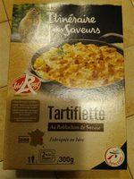 Ingredients: Pommes de terre 52%, Reblochon de Savoie AOP 20% (lait cru de vache, sel, ferments lactiques, présure, colorant de croute : rocou), lardons fumés 10% (poitrine de porc, sel, dextrose, acidifiant : E330, conservateurs : E301, E250), oignons, crème, eau, fécule de pomme de terre, sel, poivre.