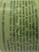 Ingredients: Huile de colza 43 %, eau, sucre, vinaigre d'alcool, jaune d'œuf, parmesan 3 % (dont lait), sauce worcestershire (vinaigre de malt (dont orge), vinaigre d'alcool, mélasse, sucre, sel, anchois (poissons), extrait de tamarin, oignon, ail, épices, arômes), sel, moutarde de Dijon 1,4 % (eau, graines de moutarde, vinaigre d'alcool, sel, conservateur : disulfite de potassium (sulfites), acidifiant : acide citrique), arôme naturel, épaississant : gomme xanthane, ail poudre (dont sulfites) 0,15 %, conservateur : E202, acidifiant : acide lactique, poivre, antioxydant : E385.