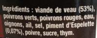 Ingredients: viande de veau (53%), poivrons verts, poivrons rouges, eau, oignons, ail, sel, piment d'Espelette poivre, sucre, thym.