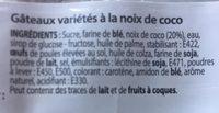 Ingredients: Gâteaux variétés à la noix de coco : farine de blé, noix de coco eau, de fructose, huile de palme stabilisant : E422, de - eccées eu sol, huile de colza, farine de soja, lait, émulsifiants : lécithine de soja, E471, poudres : (450 (500, colorant : carotène, amidon de blé, arôme . i}cvt contcn;tdcstracesdelaitetdefruitsà coques.
