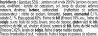 Ingredients: Garniture 55% : jambon cuit choix 29,9% (jambon de porc, eau, acidifiant : lactate de potassium, sel, sirop de glucose, arômes naturels, dextrose, LACTOSE, antioxydant : érythorbate de sodium, conservateur : nitrite de sodium, ferments), BEURRE, EMMENTAL 8,1%, salade 8,1%. Pain spécial 45% : farine de BLE (France), eau, farine de SEIGLE, sucre, huile de colza, levure, sirop de glucose, GLUTEN vital de BLE, protéines de BLE, sel, vinaigre d'alcool, germes de BLE, farine de BLE malté, levain de SEIGLE, farine d'ORGE maltée toastée.