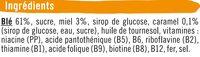 Ingredients: BLÉ 61%, sucre, miel 3%, sirop de glucose, caramel 0.1% (sirop de glucose, eau, sucre), huile de tournesol, vitamines : niacine (PP), acide pantothénique (B5), B6, riboflavine (B2), thiamine (B1), acide folique (B9), biotine (B8), B12, fer, sel.