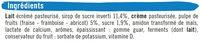 Ingredients: LAIT écrémé pasteurisé, sirop de sucre inverti 11,4%, CRÈME pasteurisée, pulpe de fruits (fraise - framboise - abricot) 5%, sucre 1,9%, amidon transformé de maïs, lactate de calcium, arômes, épaississant : gomme guar, ferments (dont LAIT), conservateur du fruit : sorbate de potassium, vitamine D.