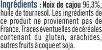 Ingredients: NOIX DE CAJOU 96,3%, huile de tournesol. Traces éventuelles de céréales contenant du gluten, arachides, autres fruits à coque et soja.