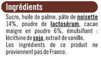 Ingredients: Sucre, huile de palme, pâte de NOISETTE 14%, poudre de LACTOSERUM, cacao maigre en poudre 6%, émulsifiant : lécithine de SOJA, extrait de vanille.
