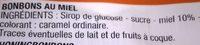 Ingredients: Sirop de glucose, sucre, miel 10%, colorant : caramel ordinaire.