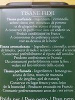 Ingredients: citronnelle, arôme citron vert, mofceaux de pomme et de gingembre. écorce d'orange A conserver de préférence dans un endroit sec Produit conditionné en France A consommer de préfërence avant fin voir au-dessous de la boite Tisana aromatizzata - Ingredienti : citronella. arotll di limetta, pezzi di mela e zenzeros scorze d arancia Conservare preferibilmente al riparo dall'ulilidita Prodotto confezionato in Francia Da consumarsi preferibilmente entro la fine : vedere sul lato inferiore della scatola Tisana perfumada - Ingredientes : lemongrass. aroma de lima, trozos de manzana y de jengibre, Piel de naranja Conservar en lugar fresco y seco, lejos de la humedad - Producto envasado en Francia Consumir preferentemente antes de : ver envase