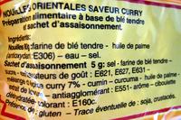 Ingredients: Nouilles 80g : farine de blé tendre - huile de palme (antioxydant : E306) - eau - sel. Sachet d'assaisonnement 5g : sel - farine de blé tendre - sucre - exhausteur de goût : E621, E627, E631 - mélange d'épice curry 7% - cumin - curcuma - huile de palme - extrait de levure - antiagglomérant : E551 - arôme - ciboulette déshydratée - colorant : E160c. Présence de gluten.
