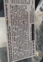 Ingredients: Pain de mie complet 50 % (farine complète de blé - eau - huile de colza - levure - sucre - gluten de blé - sel - dextrose - farine de blé - émulsifiant : E471 - conservateur : E282 - agent de traitement de la farine : E300) - crudités 22,5 % (tomate - concombre - salade iceberg) - fromage frais 10% - fromage de chèvre 10 % - bacon cuit choix goût fumé 7,5 % (viande de porc - sel - dextrose - arôme de fumée - acidifiant : E330 - antioxydant : E316 - conservateur : E250).