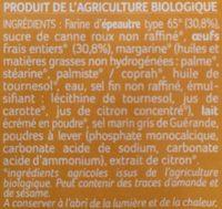 Ingredients: PRODUIT DE L'AGRICULTURE BIOLOGIQUE : Farine d'épeautre type 69 (30,870) sucre de canne roux non œufs frais entierse margarine*' (huiles et matières grasses non hydrogénées : palme stéarine, palmisteo / coprah6, huile de tournesol', eau, sel fin non raffiné, émul- sifiant : lécithine de tournesol. jus de carotte, jus de citron concentréOt lait écrémé en poudre, sel marin gns de Guérande. poudres à lever (phosphate monoca!cique, carbonate acide de sodium, carbonate acide d'ammonium), extrait de citron'. tnqrédients agricoles issus de Itagriculture biotogique. Peut conten:r des traces d'amande et de sésame A conserver à l'abri de la lumière et de la chaleur.