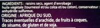 Ingredients: raisins secs, agent d'enrobage : huile végétale (tournesol et/ou colza et/ou coton), conservateur : anhydride sulfureux