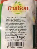 Ingredients: noix de capit crues décorticu:ées. Origine: Traces antuelles d'arachide, d "'tres fruits à coque, de sésame, de gluce d'anhydride sulfureux et de soja. Valeurs nutritionnelles moyennes poui 100g : Energie : 2315 kcal, matières grasses : 44g dont acides ? satwés : glucides : 33g dont sucres 6g$ fibres alimentaires : 3.3g, protéine 18g, sel : 0,01g. conditionné sous atmosphère protectrice. 1 kge Poids A consommer de préférence avant le . NO 17332008