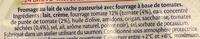 Ingredients: Lait,crème, fourrage tomate 12% (tomate (4%), eau, concentré de purée de tomate (1%), ail, huile d'olive, saccharose, amidon, origan, tomates séchées (0,4%), sel, piment de cayenne, poivre noir, arôme naturel), sel, sorbate de potassium.