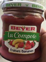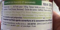 Ingredients: Fruits (Fraises, Bananes) - Sucre de canne - Gélifiant : Pectine de 100q? Enerye 397 kJ 94 kcal Matières grasses 21 dont sucres 18g Fibres alimentaires : 1/5 g - Nos compotes sont préparées TRADITIONNELLEMENT en CHAUDRC Aconserver au frais après ouverture et à consommer sous hurtovfescorrespondances, veuillez écrire à : SAS BEYER - SERVICE QUAIlTÉ?68120fg:: n BEYER, UN PETIT sur - fr.com.