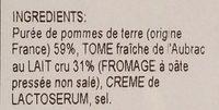 Ingredients: Purée de pommes de terre (origine France) 59% TOME fraîche de l'Aubrac au LAIT cru 31% (FROMAGE à pâte pressée non salé), CRÈME de LACTOSÉRUM, sel.
