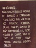 Ingredients: Manchons de canard (origine UE) flambés à l'Armagnac (53%), sauce (eau, vin rouge AOC Bergerac (sulfites) (9,5%), oignons, amidon de maïs transformé, sel, sucre, graisse de canard, sang de porc, ail, poivre), champignons, carottes, oignons grelots.
