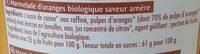 Ingredients: Sucre de canne* non raffiné, pulpes d’oranges* (dont 70% de pulpe d'oranges* amères) avec écorces en lamelles, eau, jus concentré de citron*, agent gélifiant : pectine de fruits. *Ingrédients issus de l'agriculture biologique. Préparée avec 25 g de fruits pour 100 g. Teneur totale en sucres : 61 g pour 100 g.
