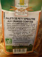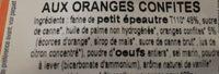 Ingredients: Farine de petit épeautre T110 48 %, sucre de canne, huile de palme non hydrogénée, oranges confites 5 % (écorces d'orange, sirop de maïs, sucre de canne brut, jus de citron concentré), poudre d'œufs entiers, sel marin, poudre à lever (bicarbonate d'ammonium), arôme naturel de vanille.
