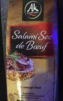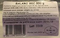 Ingredients: SALAMI sec 300 g Ingrédients.' Maigre et gras de boeuf (origine UE), Sel, Dextrose, Sucre, stabilisant (E450 ,E452, E451) ,Epiceg, conservateur : 2252, ferments de maturation carbonatede calcium, envelcppe : collagène, eau, cellulose, 1589 de viande pour 1009 de produit fini, Vc/eurs énergéhque et nutritionne//es moyennes pour 1009.' valeur énergétique 1178 kJ/282 kcal, matière grasse 16.59 dont acides gras saturés 729, 6/uc;des 0.419 dont sucres 0.419, ProNines 32.9 9, Se/ 4.89 Conditionné sous atmosphère protectrice. A conserver de préférence à 180c maximum. A consommer de préférence avant: 18%1/18 Lot: 3319 59-295-102 Poids net 2300 g CE 3 3S1130 32