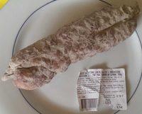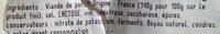 Ingredients: Viande de porc origine France (148 g pour 100 g sur le produit fini), sel, lactose, vin, dextrose, saccharose, épices, conservateurs : nitrate de potassium, ferments. Boyau naturel, cendres.
