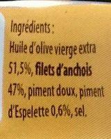 Ingredients: Huile d'olive vierge extra 51.5% filets d'anchois 47%, piment doux, piment d'Espelette 0,6%, sel.