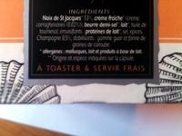 Ingredients: Noix de St Jacques 53%, crème fraîche (crème, carraghénanes 0,02%), beurre demi-sel, lait, huile de tournesol, émulsifiants : protéines de lait, sel, épices, Champagne 0,5%, stabilisants : gomme guar, farine de graines de caroube