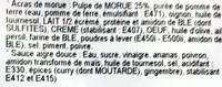Ingredients: acras de morue : pulpe de MORUE 25 %, purée de pommes de terre (eau, pommes de terre, émulsifiant : E471), oignon, huile de tournesol, LAIT 1/2 écrémé, protéine et amidon de blé, dont sulfites, CRÈME (stabilisant : E407), OEUF, huile d'olive, ail, persil, farine de BLÉ, poudre à lever (E450i, E500ii, amidon de BLÉ), sel, piment, poivre sauce aigre douce : eau, sucre, vinaigre, ananas, poivron, amidon transformé de maïs, huile de tournesol, sel, acidifiant : E330, épices (curry dont MOUTARDE), gingembre), stabilisant : E412 et E415.