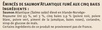 Ingredients: SAUMON Atlantique (Salmo salar) élevé en Irlande -Norvège-Royaume Uni 93%, sel 3%, cinq baies 2,9% (poivre noir, poivre blanc, poivre vert, piment de la Jamaïque, baies roses), coriandre, sirop de glucose de maïs.