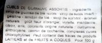 Ingredients: Sirop de glucose de blé, sucre, sirop de sucre inverti, gélatine, amidon de blé, sirop de sorbitol, arômes naturels goût fleur d'oranger, violette, mandarine, citron, anis, colorants origine naturelle : curcumine, anthocyane, carmin de cochenille, complexes cuivre chlorophyllines.
