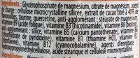 Ingredients: ngrédients : Glycérophosphate de maanésium, citrate de magnésium a ent de charge : cellurose microcrystalline Silicée, extrait de cacao titré à (0%0 de fiavonoldes taurine, quercéùne, anti-agglomérant : stéarate de maonésium, vitamine B} (acide folique), vitamine B3 (nicotinamide), vitamine 88 (biotine) anti-acglomérant : silice, vitamine B5 (calcium pantothénate), vitamine Bd chlorhydrate de pyridoxine), vitamine BI (thiamine HCI), vitamine 82 riboflavine), vitamine Bü (cvanocobalamine agents dlenrobage roxypropylméthylcellulose, acide stéarique et cellulose microcrystalline.