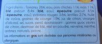 Ingredients: Tomates 28%, eau, Hé précuit 11% (blé, eau), pois chiches 11%, mdlS 8,1%, tomates demi-cerise 5,4%, huile de colza, poivrons rouges 2,7%, moutarde de Dijon (eau, graines de rnout?de, vinaigre dalcool, sel, acidifiant . acide citrique, conservateur : disulfite de potassium) (contient sulfites), vinaigre dalcool, sucre, sel, concentré de tomates, basilic, épaississants : gomme guar et gomme xdnthane, piment doux, thym, jus de citron concentré, poivre. Les informations en gras sont destinées aux personnes intolérantes ou allergiques.