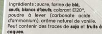 Ingredients: Sucre, farine de blé, œufs, blancs d’œufs, colorant E120, poudre à lever (carbonate acide d’ammonium), arôme naturel de vanille.